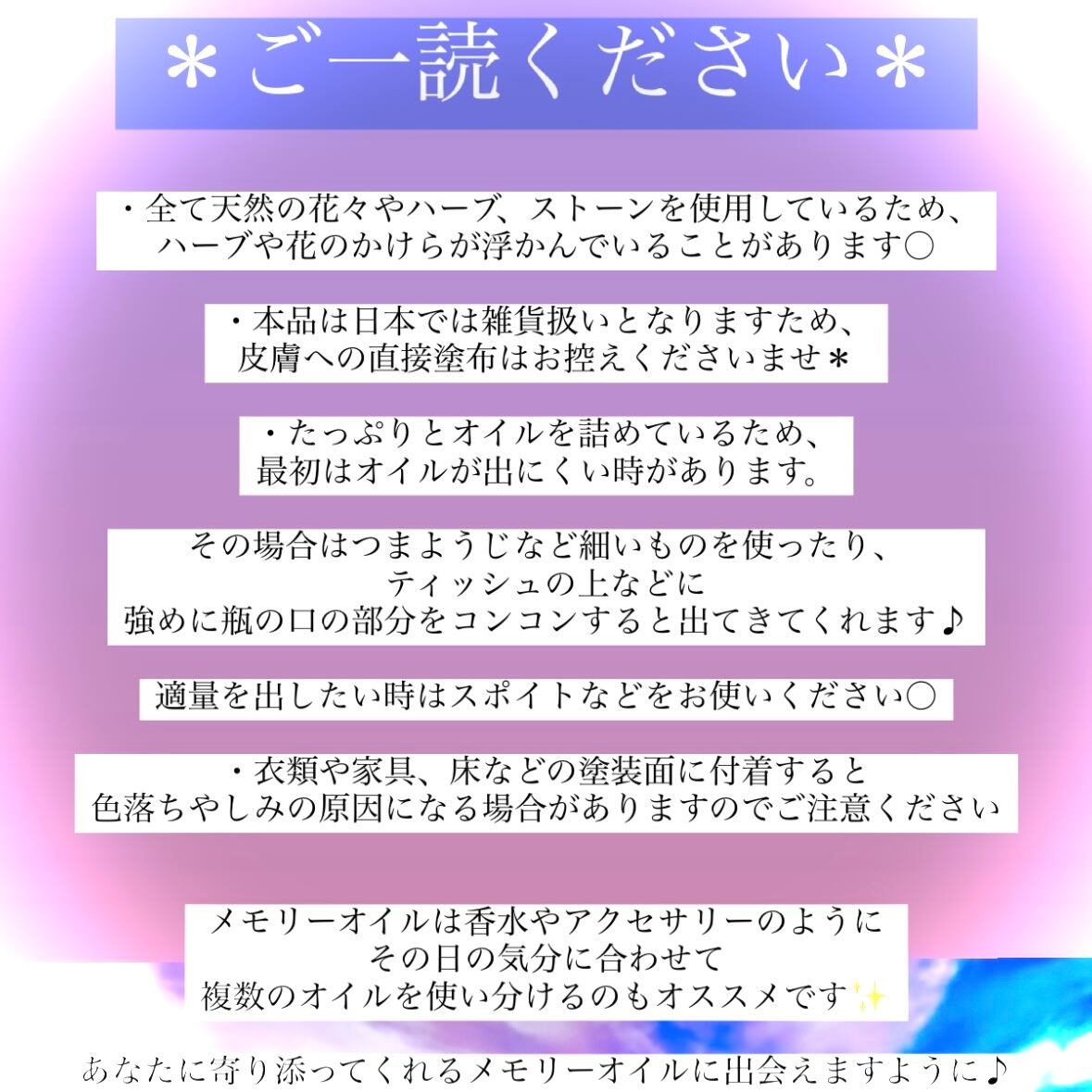 メモリーオイルは自然由来のキャリアオイル、様々なハーブやお花、天然石に漬け込まれながら丁寧に作られており、それぞれ使われるハーブや石も異なるので、色や香り、込められたエネルギーも様々○°.