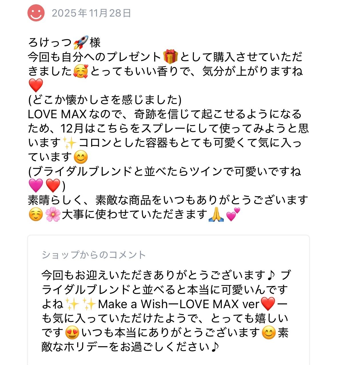 例年のブレンド内容に加え、「LOVE」要素の強いメモリーオイルをシークレットでたっぷりと潜ませております✨